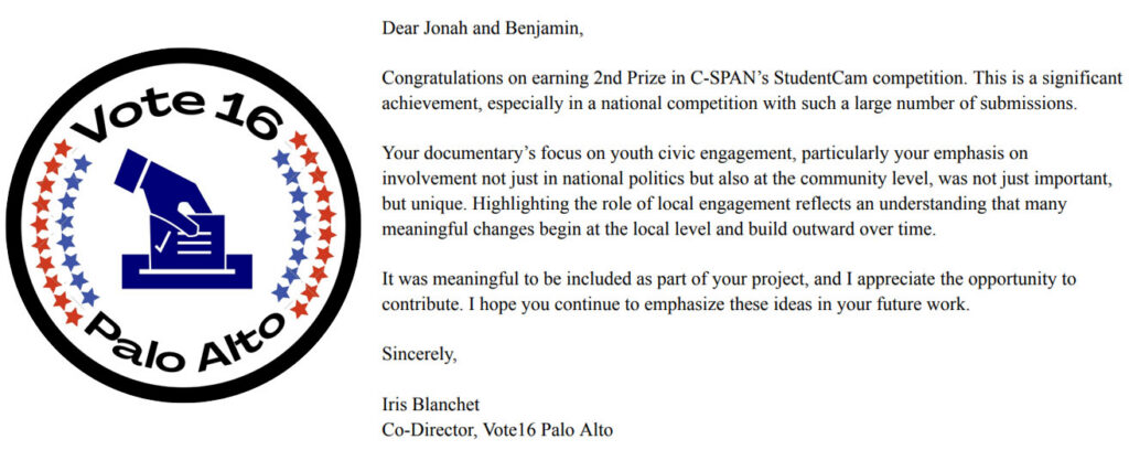 11th & 10th grade siblings Jonah & Benjamin Sandel from Palo Alto Senior High School in California won 2nd Prize in the High School Western division for their documentary, “Claiming our Consent: Reengaging the Youth Vote.” As 2nd Prize winners, they will split $1,500 in prize money.