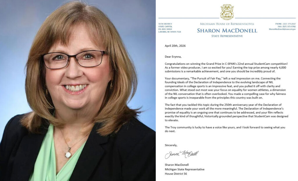Erynna Holbrook from Troy Athens High School in Troy, Michigan won Grand Prize in the C-SPAN 2026 StudentCam documentary competition for her video titled, “The Pursuit of Fair Pay,” about the impact of NIL on college sports.. As our Grand Prize winner, Erynna receives $5,000 in prize money.